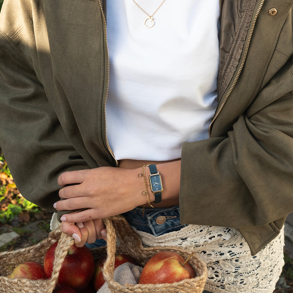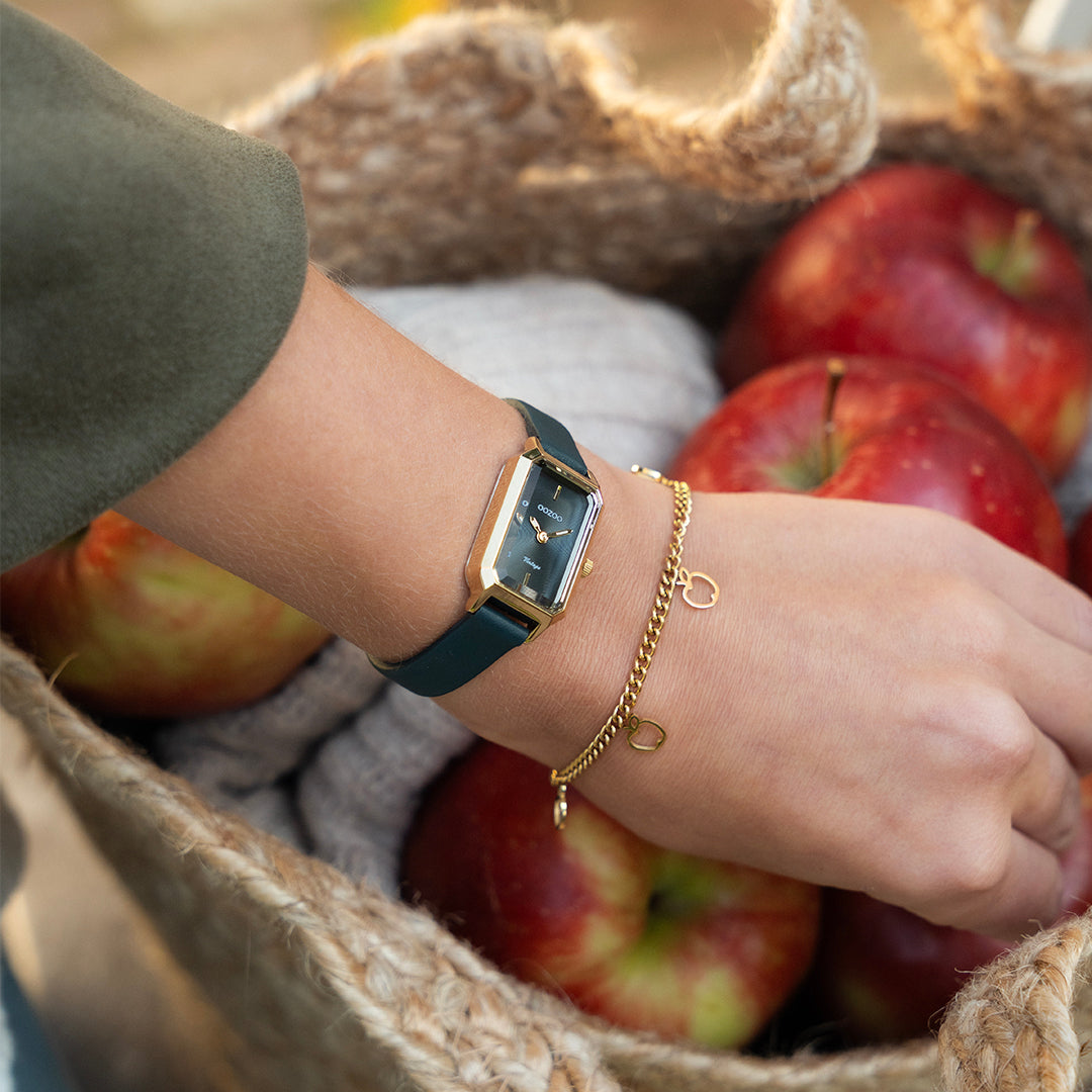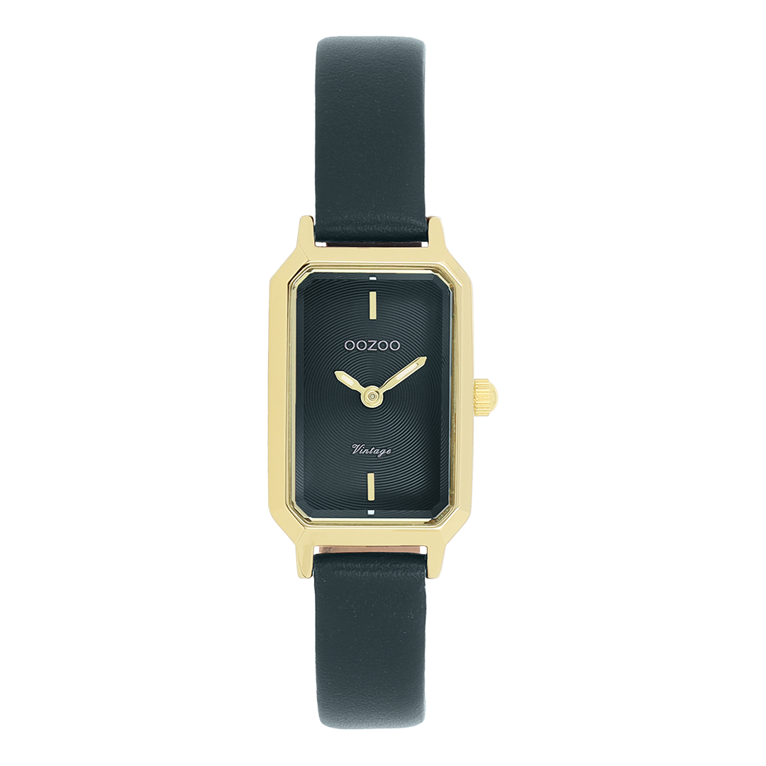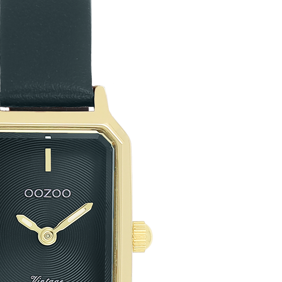 The classic look stays key in this trendy series and therefore, this rectangle OOZOO vintage design with a playful wink is the season must-have! This ladies watch is the perfect combination of fashion and comfort with its 22x19 mm gold coloured metal watch case and dark green sunray dial. The dark green leather strap makes this watch a trendy accessory, which you can wear every day. The dial has gold coloured stripes digits and matching hands. The C20422 adds the sparkle to your outfit. The mineral glass lays in a mm slim metal watch case with IP-plating. This design has a stainless steel backplate and is nickel safe. This watch has a 2ATM Japanese movement and is covered by a 2 year warranty (see section 3 of our Refund, shipping & warranty policy).
