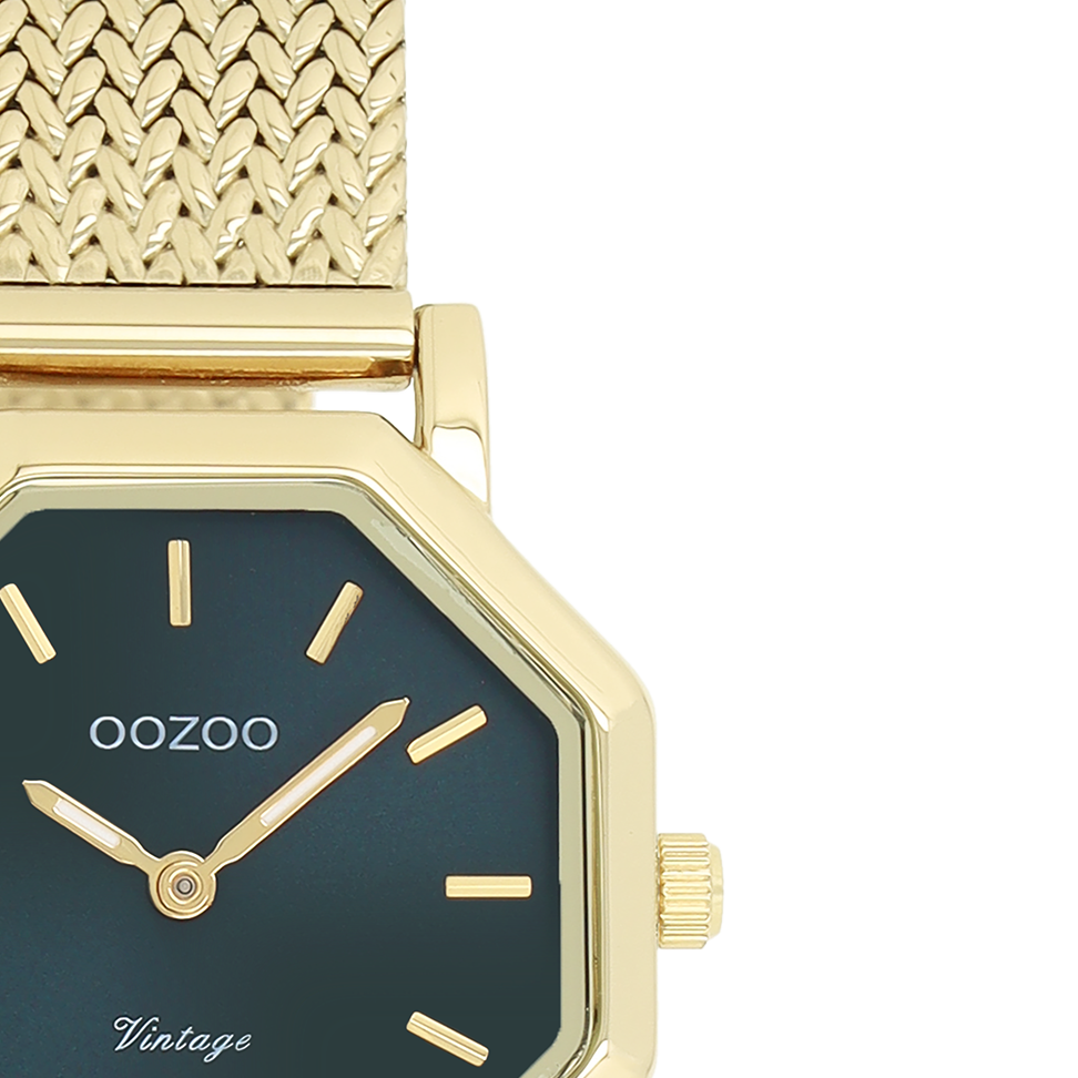 The classic look stays key in this trendy series and therefore, this octagon OOZOO vintage design with a playful wink is the season must-have! This ladies watch is the perfect combination of fashion and comfort with its 28x28 mm gold coloured metal watch case and dark green sunray dial. The gold coloured metal v-mesh bracelet makes this watch a trendy accessory, which you can wear every day. The dial has gold coloured stripes digits and matching hands. The C20438 adds the sparkle to your outfit. The mineral glass lays in a mm slim metal watch case with IP-plating. This design has a stainless steel backplate and is nickel safe. This watch has a 2ATM Japanese movement and is covered by a 2 year warranty (see section 3 of our Refund, shipping & warranty policy).