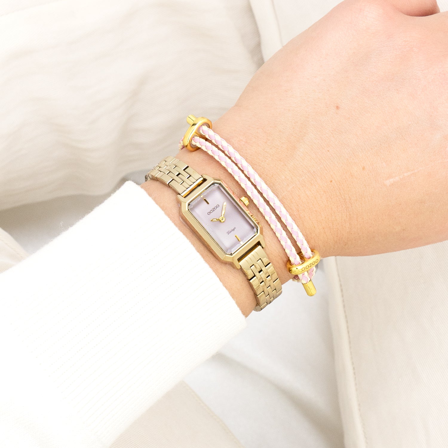 The classic look stays key in this trendy series and therefore, this rectangular OOZOO vintage design with a playful wink is the season must-have! This ladies watch is the perfect combination of fashion and comfort with its 22x19 mm gold coloured metal watch case and pink circle pattern dial. The gold coloured stainless steel bracelet makes this watch a trendy accessory, which you can wear every day. The dial has gold coloured stripes digits and matching hands. The C20458 adds the sparkle to your outfit. The mineral glass lays in a 9,5 mm slim metal watch case with IP-plating. This design has a stainless steel backplate and is nickel safe. This watch has a 2ATM Japanese movement and is covered by a 2 year warranty (see section 3 of our Refund, shipping & warranty policy).